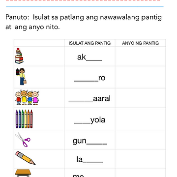 Naririto ang mga anyo o pormasyon ng pantig. Payong mo laro sumayaw Parirala mga lipon ng salita na walang simuno at panaguri at walang buong diwa. 23062016 Each worksheet asks the student to write the missing syllable pantig in order to complete the Filipino word for the illustration shown.